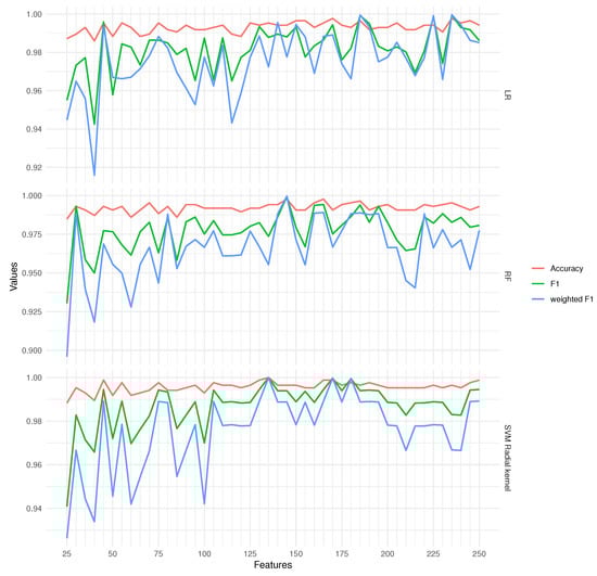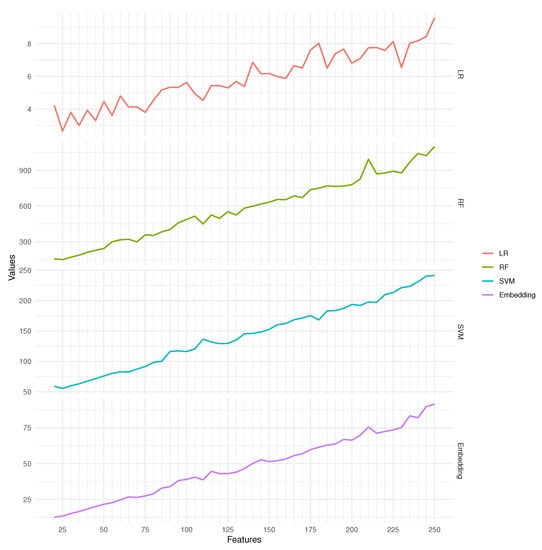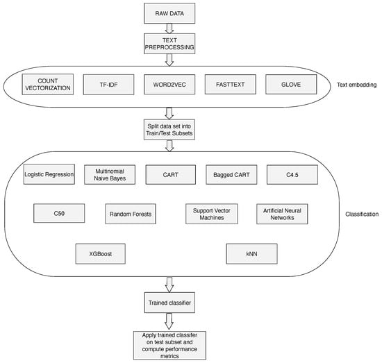 We implemented this vectorization method with the superml R package [], using n-grams ranging from one to three words and removing the stop-words. The resulting vectors had more than 32,000 elements, which would be a serious issue for some of the machine-learning methods used for classification. Therefore, we limited the dimension of the embedding by considering only the first 3000 terms (single words and n-grams) ordered by their frequency. This value could be considered a parameter, and a search operation for the optimum value could be performed.