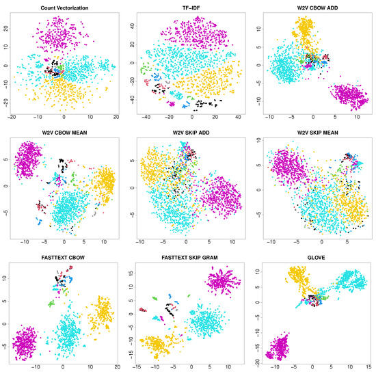 Transforming text data into numerical representation meant building a vector with certain properties for each word. One important property of such a method would be to obtain similar embedding for similar words. Currently, there are several word-embedding techniques with different properties and characteristics. We selected the count vectorization [], term-frequency—inverse-document-frequency [], Word2Vec [], FastText [], and GloVe [] methods to be used in our study.