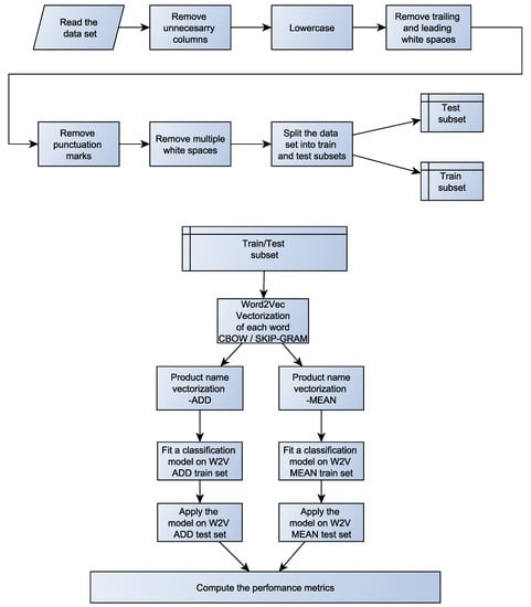 Therefore, in our case, y was the class of a product (with 15 different possible values for our particular dataset) while was the name of the product. Because machine-learning-classification methods used numerical vectors as inputs, in order to be able to use any classification method, the first step was to transform the actual inputs (text data = the name of a product) into numeric values. Before applying the word-embedding techniques, we pre-processed our data by: