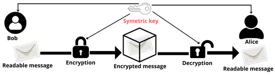 Cryptography is the process of converting data from readable to unreadable form, and it plays a vital role in ensuring security requirements [15,32]. The original objectives of cryptography were to ensure the privacy, integrity, authenticity, and non-repudiation of data [14]. There are various cryptographic mechanisms for encrypting data, including asymmetric encryption, which uses a set of two keys: a public key for data encryption and a private key for data decryption. Another mechanism is symmetric encryption, which uses a single unique key for both encrypting and decrypting data. Figure 2 illustrates how encryption works with a symmetric key system.