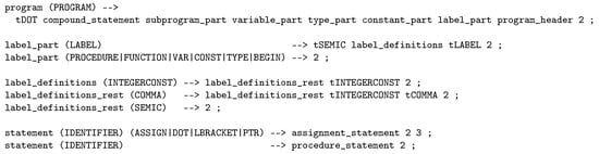 - Limited backward jumping algorithm:If the rule has been applied in the previous step at position i, rule cannot be applied in the next step left of position , as otherwise, the rule should have taken precedence over in the previous step. Even more, depending on the overlapping of and , the first position, where is applicable in the next step, might be even further to the right (sometimes so much that it is actually a jump forward). Hence, instead of jumping back to the beginning of , the algorithm must jump back only as far as the rule with the longest backward jump relative to requires (see [8] for full details).This approach is implemented in WEB and CWEB [13,14], where the parsers are implemented by hand. A Deterministic Finite Automaton (DFA) for finding out which left side matches at the given position is implemented by a series of nested (WEB is written in Pascal) and (CWEB is written in C) statements. Although error prone, the length of a backward jump for each right side is calculated by hand.A very similar technique is used in optimizing the implementation of Markov normal algorithms [56]. However, because the indexation of rules introduces precedence, the lengths of rules already applied are kept on the auxiliary stack, which makes implementation slightly more complicated.