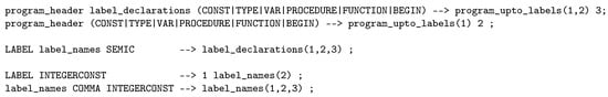 Formal grammars are special cases of rewriting systems. Let N and T be finite and disjoint sets of nonterminal and terminal symbols, respectively, and let . A grammar G is defined as , where is the start symbol and is a finite set of productions . If , the grammar is said to be context-free. If , the grammar is context-sensitive. Sometimes these grammars are called Type 1 monotonic grammars, while the term context sensitive grammars is reserved strictly for grammars consisting of productions, where exactly one nonterminal symbol on the left side is substituted by a nonempty string of symbols [17]. However, because each context-sensitive grammar in the stricter sense can be transformed into a Type 1 monotonic grammar [19], the former are considered just a normal form of the latter and no distinction needs to be made for the purpose of this paper. If and , the grammar is said to be context-free. For a context-free grammar , the standard definitions of functions and are assumed [15,18,19].