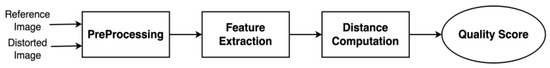The FR-IQA algorithm as shown in Figure 1 inputs the original image, that is, the reference image, and the distorted image, that is, the quality image to be judged. After the image resolution is unified through preprocessing, the features of the images are extracted through feature extraction, and then, the distance between the distorted image and the reference image is calculated to obtain the image quality score of the distorted image.