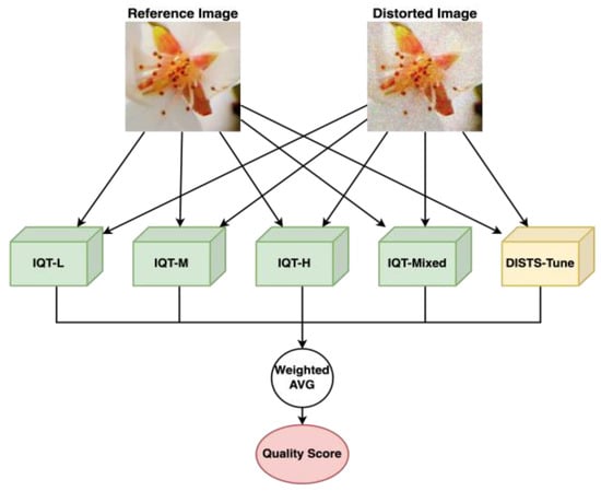 In the test phase, the image is cropped into five overlapping H × W patches: left-top, right-top, left-bottom, right-bottom, and center. The predicted score of a distorted image is an average of five patches of the test image. Each test image has five predicted scores of five models, namely IQT-L, IQT-M, IQT-H, IQT-Mixed, and DISTS-Tuned. Then, the sum of weights is obtained with the predicted score of each distorted image as the ATDIQA predicted score.