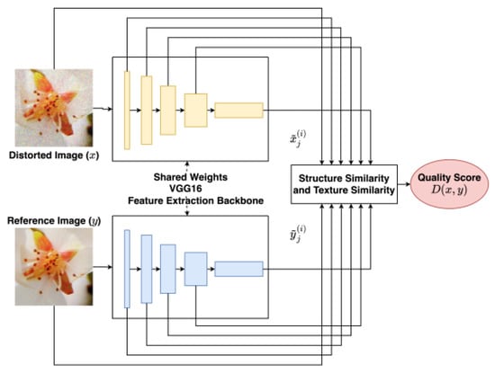 Deep image structure and texture similarity (DISTS) is a CNN-based FR-IQA, as shown in Figure 3, proposed by K. Ding et al. in 2020. DISTS has two components: a feature extraction backbone and image structure and texture similarity computation as the quality score. The feature extraction backbone is pre-trained by VGG16 [42] to extract feature maps from layer conv1_2, conv2_2, conv3_3, conv4_3, and conv5_3. It contains different levels of features including structure and texture information. The other component is the weighted summation of texture and structure similarity for each feature level and the output quality score.