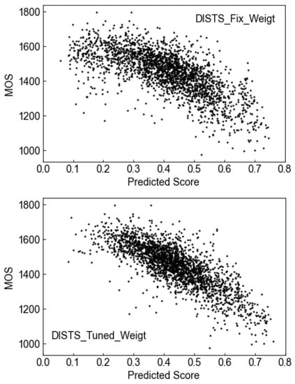 In Figure 5, the scatter plots show the comparison between, with, and without DISTS backbone weight. It can be observed that the backbone-weight-tuned DISTS model obtained better correlation with MOS with smaller variance, shown by the 5% model performance improvement given in Table 4.