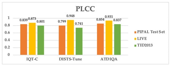 PLCC in IQT-C (baseline), DISTS-Tuned (CNN-based IQA), and ATDIQA (ensemble IQA) in the PIPAL test set, LIVE, and TID2013 dataset.