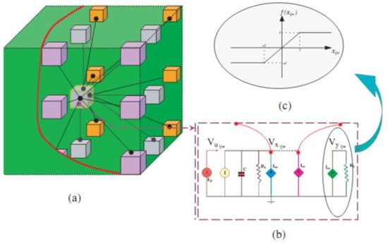 The dynamics of CNN are described mathematically in [] by its states equations, which are obtained by applying Kirchhoff’s law to the circuit implementation of the CNN given in Figure 2b: