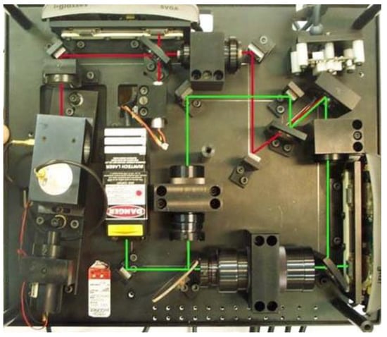 In order to implement a topographic sensory computer, we use the principles from physics or biology. In optics, the spatial correlation is applied at the speed of light. For the construction of the POAC []—programmable optoelectronic analogic CNN computer—the 4 f focal plane system using two lenses and a programmable light value is implemented with programmable light transmissivity in each pixel. The POAC laptop realization is shown in Figure 3, in which two different lasers (red and green) are used together with a local analog memory array. The templates are big enough. In this implementation, the nano-device’s functions are introduced and defined. In this way, we can produce an array that is locally active, as well as having some sparse global lines by means of optical interconnection.