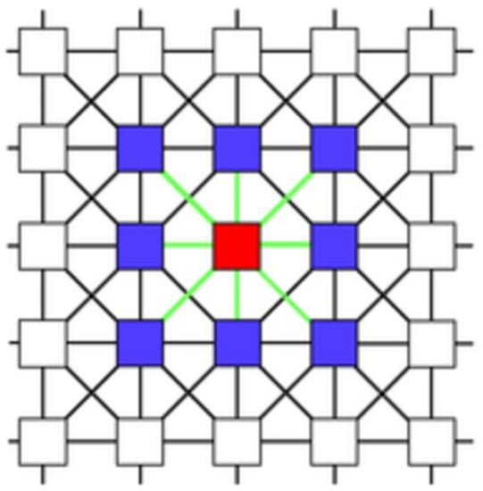 Let us consider the following CNN architecture: a two-dimensional grid with a 3 × 3 neighborhood system, as shown in Figure 4. The cells are represented by squares, and the coupling is presented by straight lines. One possible neighborhood of a cell (in red) is shown by the blue squares and green straight lines, so the red cell has nine possible neighbors [].