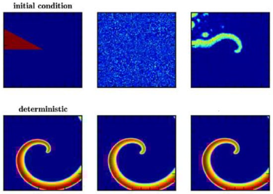 As we pointed out in Section 5 for the Oregonator MCNN model, we can determine the edge of chaos domain of the parameter sets in which complex behavior can emerge. Nonuniform spatial patterns are generated in this model, and they are presented in Figure 7. The initial state of all the Oregonator’s cells is set to be the inactive state. After stimulating the center node, the excitable waves propagated outwards, as shown in Figure 8. Among the demonstrated behaviors, the nonuniform spatial-pattern generation is applied to investigations detecting the pattern generation due to the memristors. Therefore, if one has proper (non-memristive) RD media and a 2-D array of memristors without any reaction circuit, and the point dynamics of the RD media are given to the memristor array, one may detect the global motions of the RD media. This application is not limited to the analysis of RD systems, but the idea can be transferred to analyzing much more complex systems, such as brain networks, social networks and so on.