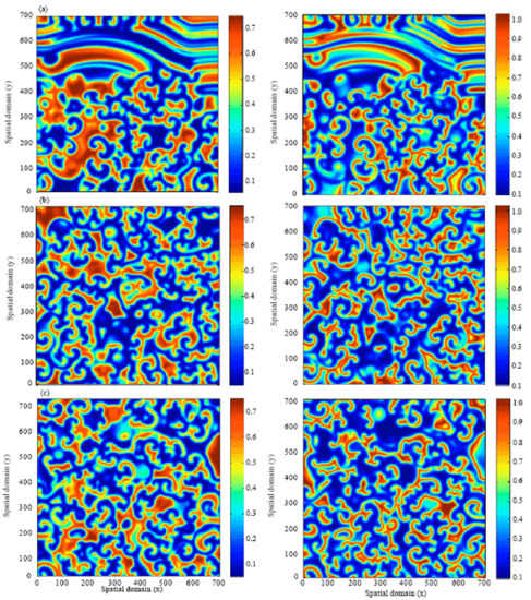In Figure 6, Turing patterns arising in a reaction–diffusion system are generated when the dynamical system is changed by replacing . In this case, with the change of the parameter, k, Turing instability occurs, and we obtain the variety of patterns shown in the figure. In the simulations λ, are the parameters of the RD system.