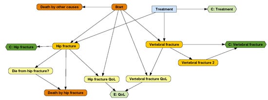 Probabilistic nodes, drawn as rounded rectangles, represent properties and events that are not controlled by the decision maker—at least not directly. Nodes colored in yellow represent chance variables and those in orange represent events. Chance variables represent system properties. For example, ‘Hip fracture QoL’ and ‘Vertebral fracture QoL’ are numeric chance variables representing how the quality of life is affected by the two types of fractures. ‘Die from hip fracture?’ is a Boolean variable that takes the value ‘true’ if, in case of hip fracture, the patient will die. Numeric variables can also be used, for example, to count the number of relapses of a disease or to represent continuous biomarkers.