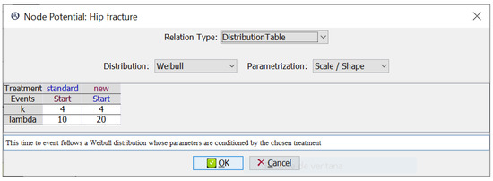 Then, the events that are children of ‘Start’, namely ‘Hip fracture’ and ‘Vertebral fracture’, are processed (line 19). The potential for ‘Hip fracture’ is a Weibull distribution whose parameters depend on the decision ‘Treatment’, as shown in Figure 2. In the configuration that we are considering, the value for this decision is the ‘new’ treatment, and the parameters for the Weibull are 4 (shape) and 20 (scale). Let us assume that the result of sampling this distribution is years. This new event, ‘Hip fracture’, is added to the calendar. Similarly, we will assume that when processing the other child event, ‘Vertebral fracture’, the time obtained from its Weibull is years; it is also added to the calendar.