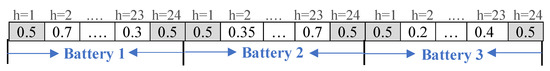 The slave stage is responsible for finding a battery power dispatch that allows for the maximum possible reduction of the objective function, using the location and type of batteries provided by the master stage. To this effect, the codification proposed in Figure 3 is employed. This codification includes a vector of size 1 × 72, in whose columns are 24 variables associated with the states of charge of each battery in the different periods of the time horizon analyzed.