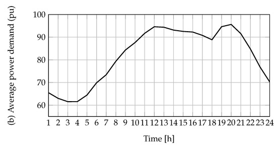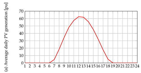 In the test system used, the PV-DGs were located at buses 13, 25, and 36, with nominal power capacities of 1.125, 1.320, and 0.999 MW, respectively [29]. The behavior of the solar energy production and power demand of Medellín was taken from [23]. In the particular case of PV generation, the temperature and solar radiation data reported by NASA [41] were used, as well as technical data on the polycrystalline PV panels, in order obtain a curve that represents the average behavior of the solar production in an average operation day (see Figure 5a). Furthermore, this study obtained a power demand curve that represents the average behavior of the users in Medellín by using power demand data reported by the local operator, Empresas Públicas de Medellín, [42] (see Figure 5b). All of the data used to elaborate these curves correspond to 2019. This year was selected with the aim to eliminate the effect of the COVID-19 pandemic on power consumption.