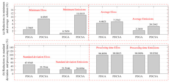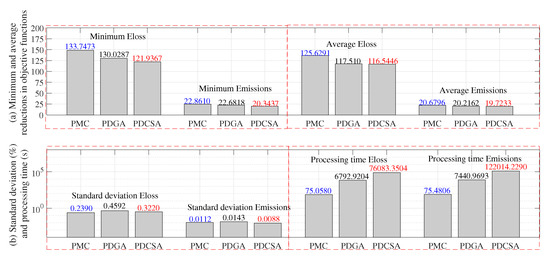 Figure 6a compares these values against those of the PMC, PDGA, and PDCSA. This figure presents the minimum and average reductions obtained by the solution methodologies for both objective functions with regard to the base case. Note that all solution methods reduce the objective functions. In the particular case of Eloss, a minimum reduction of 130.0287 kWh was obtained, while the average reduction was 117.5107 kWh (5.2334% and 4.72961%, respectively). These reductions are significant for the GCN; in order to highlight their importance, note that they imply a reduction of 42.8914 MWh for a year of operation.