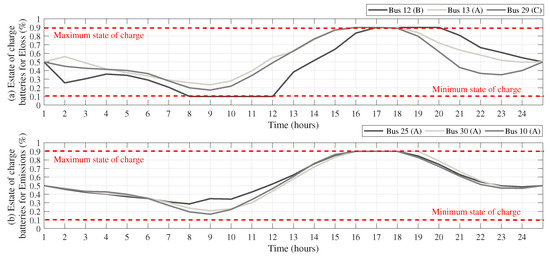 The operation of the BS regarding the reduction of CO2 emissions is illustrated in Figure 8b. In this case, the BS were located at buses 25, 30, and 10 (all of them type A). The batteries follow the same dynamics: they start at 50% SOC, discharging all batteries until hour 9. They start the charging process from this hour until hour 16, and they discharge until hour 24, achieving the final SOC (50%). The batteries satisfy the state-of-charge limits at all times.