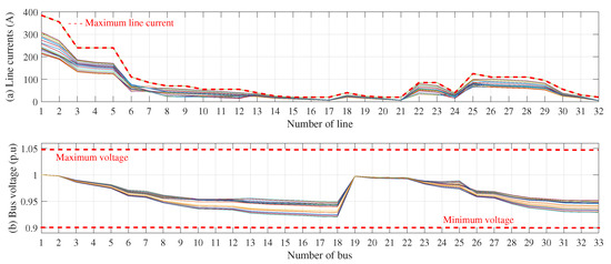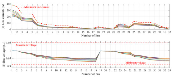 Finally, Figure 9 and Figure 10 present the line currents and voltage profiles for the different operation hours. By analyzing the current limits, it is possible to note that the maximum line current limits are satisfied at all times. In the same way, all voltage profiles are within the voltage limits set for the GCN (+/− 10% of the nominal voltage: 1 p.u.).