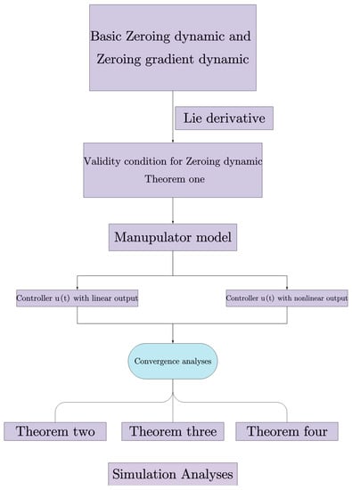The remainder of this paper is organized into the following five sections, and the main content of this paper is shown in the Figure 1. Section 2 presents the related zeroing dynamics and zeroing-gradient dynamics models for the tracking control theory. Meanwhile, we establish and prove our first theorem about the applicable conditions of the ZD model with order-n through the Lie derivative, give a unified formula for ZD models with order-n, and formulate the dynamic system of the single-link manipulator with flexible joints. Section 3 presents the ZD model for the tracking control system with a single linear output, and the ZGD model for the tracking control system with a single nonlinear output of a single link manipulator with flexible joints. Section 4 presents the convergence property of the ZD and ZGD models for solving the tracking control problem with single linear or nonlinear outputs of the single-link manipulator with flexible joints. In addition, we also present our other three theorems about the global exponential convergence property of the ZD controller u(t) and the steady-state tracking error bound of the ZGD controller u(t) and the radius bound for exponential convergence of the steady-state tracking error. Section 5 conducts several relative extreme simulations to show the validity and parameter influences of the ZD model and ZGD model for solving the tracking control problem with single linear or nonlinear outputs of the single-link manipulator with flexible joints. We conclude this paper in Section 6, as follows: