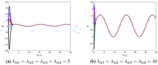 Moreover, we also illustrate the tracking performance of the ZD controller (21) with different parameter values to solve the tracking control problem with a single linear output of the single-link manipulator with flexible joints for the desired path in Figure 4, where Figure 4a shows the tracking performance of the ZD controller (21) with different parameter values , and Figure 4b shows the tracking performance of the ZD controller (21) with different parameter values . From Figure 4, we can see that the convergence time decreases, as the model parameter values increase.