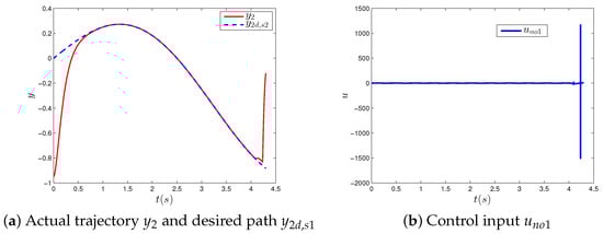 From Theorem 1, we can see that the ZD model with order-n can be used to design a controller to track the desired path , if the nonlinear control system (1) has a relative degree n in the domain . Moreover, when the dimension of is equal to 1, the controller is represented as the following formula by Equation (13):
