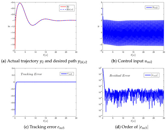 where ,,, and are elements of the state vector, and and are the time derivative for x1 and x3. Moreover, is the control input. The values of parameters , , , , , , , , and of the single-link manipulator with a flexible joint can be found in Table 1 [41]. We also denoted y as the system output, and the desired output is denoted as yd. Therefore, the task of the tracking control problem is to design a controller u to track the desired trajectory , and the tracking error can be written as y-yd, and it approaches zero as time t evolves. In addition, we correspond the dynamic model (17) of a single link manipulator with a flexible joints with the generalized nonlinear system (1) by the following rewriting vectors: