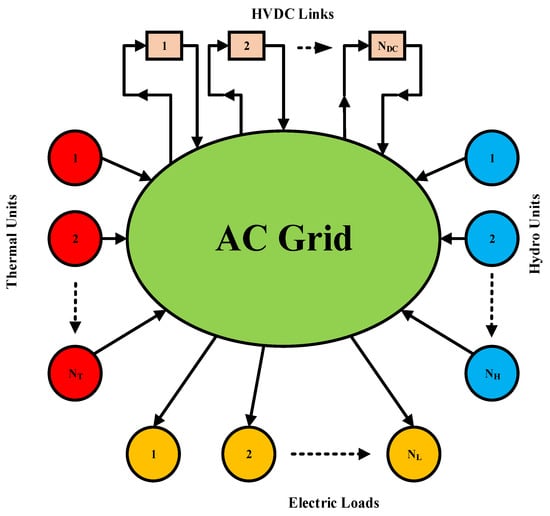 Figure 1 shows an electric network in which a number of hydel and thermal power plants are embedded. The inward arrows show that the power is delivered to the network. The loads are attached to the network. Here, outward arrows show the flow of power from the network to the loads. The HVDC blocks take power from certain buses (represented by outward arrows) and deliver it to other buses of the network (represented by inward arrows). The idea is to propose a Lagrange function for such a network considering all the generation, load, and network constraints. The following steps are being followed.