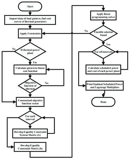 Equation (27) is only used as leftover water volume in one interval to be used in the next load interval in constraint expression (24). Inequality constraints for a single load period given in (25) are modified for 24 h load intervals accordingly. The algorithm flow chart of the proposed approach is shown in Figure 3 to implement (8) using (15) with constraints from (9) to (13) and realistic equations from (16) to (27) for all load periods in MATLAB Software.