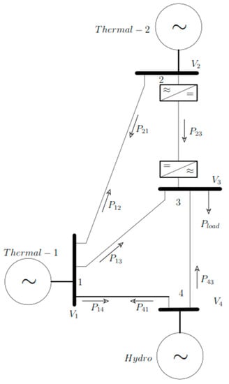 A case study is designed to verify the effectiveness of the proposed methodology. Four bus AC systems with two AC grids are interconnected by point-to-point HVDC transmission link, shown in Figure 4. It is ensured that the modelled HVDC link agrees with (4). The cost curves of the thermal power plant and flow rate characteristics of the hydro power plant are shown in Table 2 and Table 3, respectively.