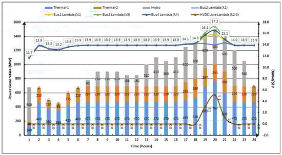 Due to combined investigations of economic hydrothermal scheduling and DCOPF at the same time, the system lambdas (λ) represent the bus location marginal price (LMP) or nodal price and line congestion price instead of the generator’s incremental cost. Figure 6 shows both lambdas (λ) under two different scenarios.