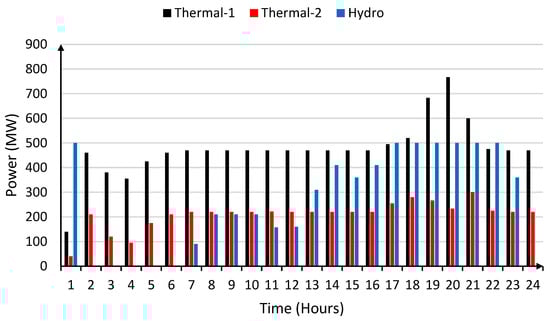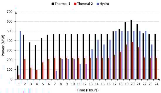 Figure 6 shows the power contribution (bar charts) of each generating station to meet the load demand. The power shared by the hydro unit to load is based on the availability of water for power generation. The power shared by both thermal units to load demand is optimized based on their cost rate characteristics shown in Table 2. Therefore, the cost of thermal power units is the minimum for typical load demand in a specific time period.