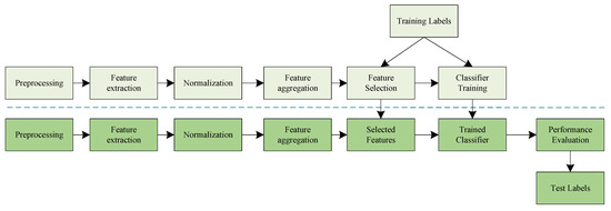 This section introduces a new framework for resolving the classification problem of normal versus pathological EEGs. The machine learning pipeline employed in this study is illustrated in Figure 1. The process involves three phases: statistical features extraction, significant features selection, and classification. Each phase is discussed in detail in the following subsections.