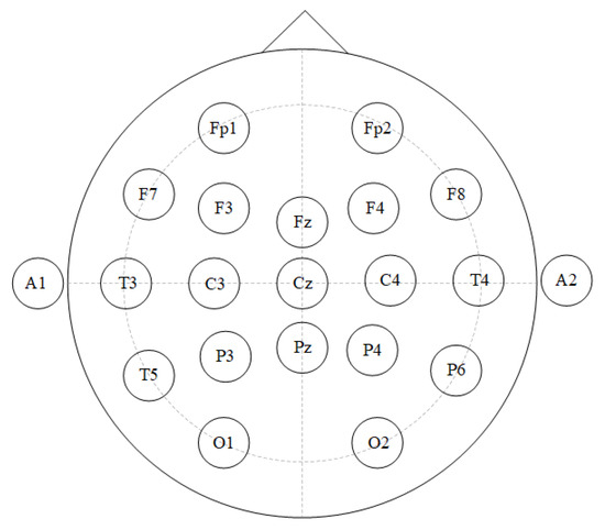 This work utilizes the publicly available EEG Abnormal Corpus V2.0.0 [29], which has been extensively studied in the literature, as in [7,8,11,30]. This database was provided by the Temple University Hospital in America and contains over 2717 multichannel EEG records collected from patients ranging in age from 7 days to 96 years. The recorded brain-related pathologies include, but are not limited to, epilepsy, stroke, and depression. The EEG recordings were obtained using common electrodes arranged according to the international 10/20 position system, as depicted in Figure 2. The database contains a minimum of 21 and a maximum of 31 EEG channels, with each recording lasting at least 15 min, and having a sampling rate ranging from 250 to 500 Hz. To ensure data consistency, the EEG signals were down-sampled to 250 Hz, and the same 21 EEG channels present in all recordings were selected (Figure 2). Additionally, neurologists have labeled each record as either pathological or normal EEG. Based on this labeling, the benchmark corpus has been separated into training and testing sets. The training set consists of 1346 pathological samples and 1371 normal samples, while the testing set consists of 126 pathological samples and 150 normal samples. The training set was obtained from 893 pathological patient records and 1237 normal patient records, while the testing set was obtained from 105 pathological patient records and 148 normal patient records. Table 1 provides a concise summary of the TUH Abnormal EEG dataset, and further information about the dataset can be found in [29].