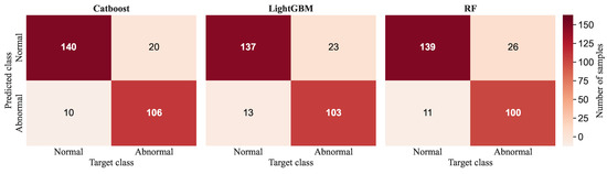 To validate the effectiveness of the selected attributes for EEG pathology classification, we conducted experiments with the proposed framework utilizing different classifiers on the same dataset. The experimental results are illustrated in Figure 6. The horizontal axis represents the target class, while the vertical axis represents the predicted class, with both normal and abnormal categories included. Our findings reveal that when using the CatBoost classifier, 6.6% of normal testing samples were misclassified as abnormal, and 15.8% of abnormal testing samples were misclassified as normal. Similarly, our framework achieved an accuracy of 86.95% and a G-mean of 86.40% using LightGBM, and an accuracy of 86.59% and a G-mean of 85.75% using RF. By comparison, we can conclude that the proposed framework based on CatBoost produces superior classification performance and is therefore chosen as the optimal classifier for our methodology.