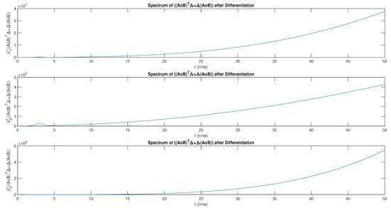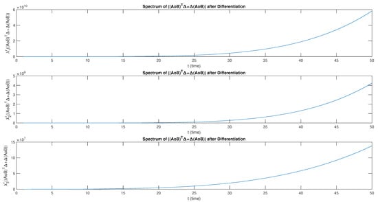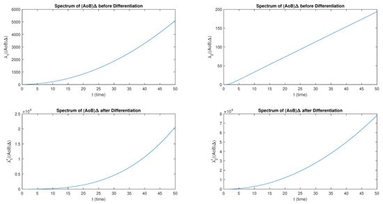 The eigenvalue before and after differentiation has a smooth non-linear growth for , as shown in Figure 4. The eigenvalues and infinitely appear to be almost zero but then become negative as t increases. Both and have a decreasing monotonic behavior before differentiation. However, after the differentiation, and become strictly positive and possess monotonically increasing behavior, as shown in Figure 5.