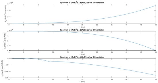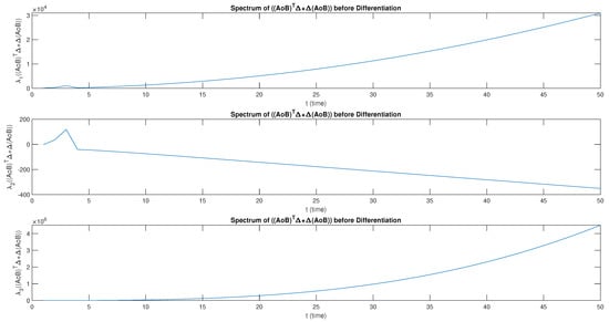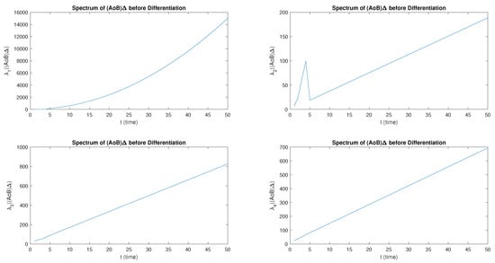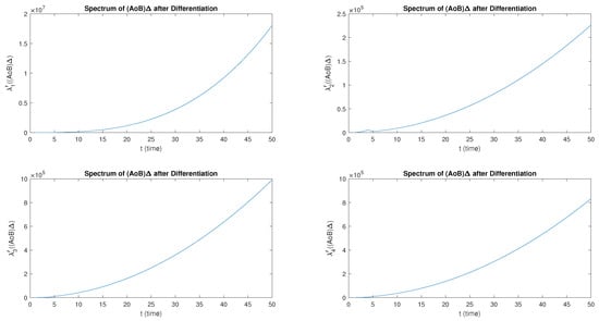 Let and be M-matrices. Consider , as the set of block-diagonal matrices. The eigenvalue before and after differentiation has a smooth growth as t increases. The eigenvalue before differentiation is obtained as positive but for it first grows rapidly and then decays. Furthermore, has a linear growth for . However, after the differential has a non-linear growth and , first grows monotonically with a small magnitude, then there is a sharp decay. The eigenvalues of and have a positive linear growth before differentiation but a smooth non-linear growth after differentiation, as shown in Figure 2. Furthermore, both and satisfy , . The behavior of the spectrum of after differentiation is shown in Figure 3.