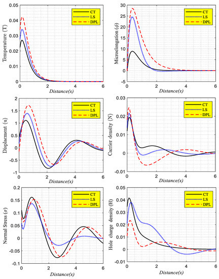 Line represents the Lord and Shulman (LS when , ) model, and the solid line represents the theory of coupled thermoelasticity (CT, when ). The first subfigure depicts the thermal (heat) wave’s distribution, which is represented by the temperature distribution, where the distribution begins at the surface’s positive value and satisfies the boundary condition [48,49]. The numerical study showed that the structure’s maximum temperature consistently occurs close to the front of the heat wave and gradually decreases as the depth in the medium increases. The thermal wave distribution rises at the surface to achieve its maximum value as a direct consequence of the laser pulses’ influence, then progressively decreases, taking the form of an exponential function. Further, under the surface, where the impact of the laser pulses is reduced, the distribution ultimately converges with the zero line to achieve the equilibrium state. These findings are consistent with what has been shown in actual experiments [50,51]. Microelongation wave propagation (the second subfigure), which begins at the surface from zero and increases in the closed initial range as a result of the action of laser pulses, may be used to characterize the microelongation scalar function. It then progressively diminishes with exponential behavior. The microelongation wave converges to the zero line far from the semiconductor surface because of the weak laser pulse effect until it reaches the equilibrium condition within the medium. The displacement distribution with increasing distance is used to indicate the shift in the elastic wave in the third subfigure. Due to the thermal impact of the laser pulses, the distribution begins at the surface nearing the zero value and progressively increases in the beginning to reach the highest value towards the edge. The distribution then alternately lowers and grows until it reaches its minimum value, just before it reaches an equilibrium state within the microelongated semiconductor medium. The increased collisions between the inner particles as a direct consequence of the heating action of the laser pulses cause this apparent perturbation in the elastic wave distribution. The fourth and sixth subfigures show the dispersion of plasma waves, which are represented by electron and hole diffusive activity with increasing distance (carrier density and hole charge density). In two cases, these distributions begin with positive values at the surface and satisfy the boundary surface conditions throughout the processes of recombination and replacement between them. When the temperature rise caused by the influence of laser pulses causes the diffusivity of electrons and holes to increase on the surface, they do so until they reach their maximum value. Moving further from the surface causes the distribution to progressively decrease until it achieves equilibrium in accordance with the zero line within the microelongated semiconductor medium, which is compatible with the experimental information and takes the shape of an exponential function [45,46]. On the other hand, the fifth subfigure depicts how the mechanical wave changes as the distance increases using normal stress distribution. The distribution starts out as a result of mechanical stress, which was applied at the surface from the positive value, satisfying the boundary condition and causing the distribution to smoothly decelerate in the initial range close to the edge. When the distribution reaches equilibrium within the semiconductor medium, it climbs gradually to achieve its maximum value before adopting a curve in the shape of wave distribution. The mechanical load and thermal impact of the laser pulses are both responsible for this apparent behavior in mechanical wave distribution. This results from the generation of mechanical forces and the operation of ultrafast lattice deformation.