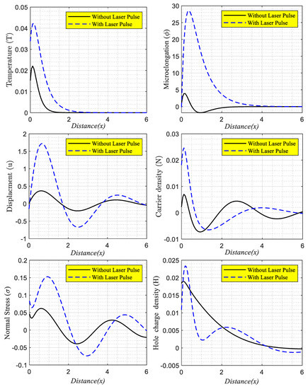 The principal fields in this phenomenon vary depending on the different values of the laser pulses based on the power intensity (the pulse parameter ) versus a horizontal distance , as shown in Figure 3 (second category). The numerical simulation is carried out during thermoelastic and electronic deformations over short moments, , under the influence of microelongation parameters, according to the DPL model. Two instances fall within this category: the first one is the disappearance of the laser pulse’s influence (without the laser pulses effect), and the second one is the case of the laser pulses’ effects (with the laser pulses effect). We investigated the impact of laser pulses on this model of equations, since it is evident that the thermal effect of laser pulses modifies the behavior of wave propagation in an obvious manner. From this, it is evident that the microelongated photothermal mechanical model, which accounts for all of these phenomena, can describe the ultrafast photothermal response to the laser pulse effect across the semiconductor medium.