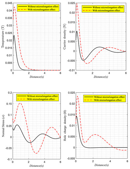 The third category (Figure 4) illustrates the variations in the main fields in this occurrence based on the different values of the microelongation parameters evaluated against the horizontal distance. The DPL model states that a numerical simulation is run during the brief electronic holes diffusion induced by laser pulses. Two instances fall within this category, the first of which is the loss of the microelongation parameters (without microelongation parameters when ), and the second one is obtained when microelongation parameters are present. On the other hand, the behavior of wave propagation varies across all distributions. It is observed that the main field distribution behavior is greatly influenced by the microelongation parameters.
