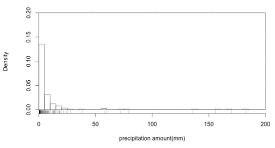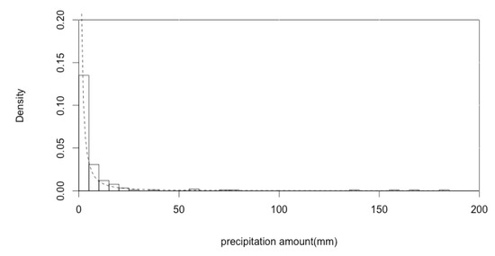 Once we have the precipitation occurrence sequence, the next step is to determine the precipitation amounts on wet days. Since the precipitation amount is generally small, we use a right-skewed probability distribution for the precipitation amount [19]. Previously, many right-skewed probability distributions, including the exponential, log-normal, and gamma, were used to describe the distribution of the precipitation amount [18,33]. In this study, we consider exponential, log-normal, and gamma distributions, and two extreme probability distributions, the general extreme value distribution (GEVD) and four-kappa distribution (K4D). Functions for the probability distributions are given in Table 7. The two extreme distributions have a thick tail, which could model the extreme amount of precipitation in the simulation. The probability distribution parameters are estimated using the maximum likelihood estimation (MLE), and the results are shown in Table 8.