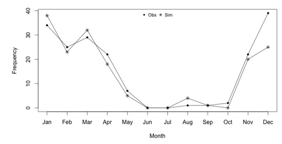 In terms of precipitation, 30 years of simulation data were generated using the stochastic precipitation model with a Markov chain. The number of wet days in the observed and simulated data is presented in Figure 2. The number of wet days in the observed and simulated data is very similar, indicating that a first-order Markov chain works well to generate precipitation occurrence. From the simulation data, the number of wet days in January, March, and August is generated more than in the observed data. The simulated number of wet days in February, April, May, October, November, and December is generally less than the observed data.
