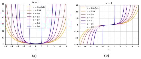 Plot of the functions for and for (a) and (b) as well as for different values of the fractional parameter . The functions were computed using numerical integration on the basis of Equation (21).