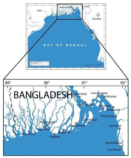- Paul, G.C.; Ismail, A.I.M. Contribution of offshore islands in the prediction of water levels due to tide–surge interaction for the coastal region of Bangladesh. Nat. Hazards 2013, 65, 13–25. [Google Scholar] [CrossRef]