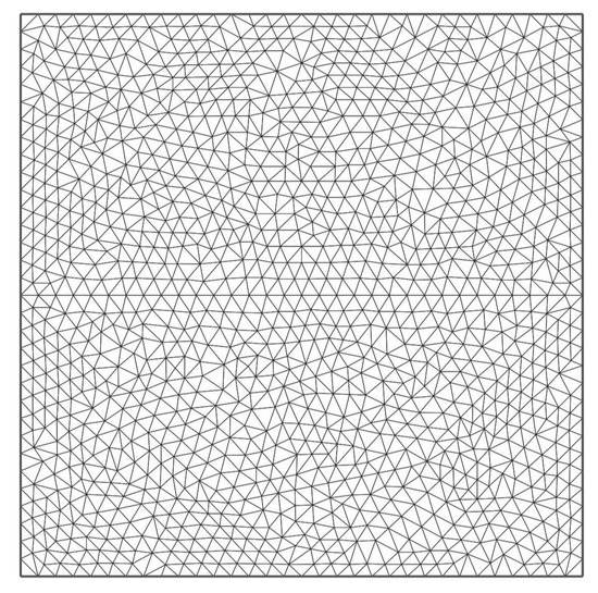 Let N be a division number of each side of the unit square domain and a representative mesh size. We prepare non-uniform triangulations of , , for and 256, cf. Figure 3 for .