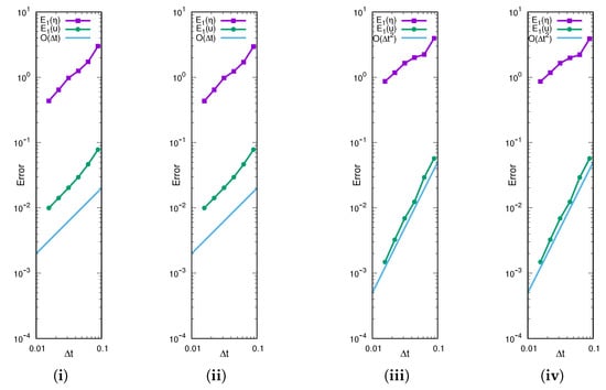 Choosing , we compute the errors, and , , by LG1 and LG2. Figure 4 and Figure 5 show graphs of the errors of and , respectively, in logarithmic scale by LG1 for Example 1 (i) and Example 2 (ii), and by LG2 for Example 1 (iii) and Example 2 (iv), and the values of errors and their EOCs are given in Table 1 and Table 2. We observe that LG2 is of second order in time numerically and that the order is higher than that of LG1. Although is not of second order in time, it is natural as Equation (3a) for does not include any diffusion term.