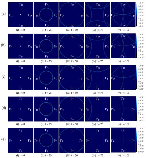 We solve Example 3 by LG2. Figure 6 shows the color contours of for , , cf. (i)–(v), for the five cases, (a)–(e). We can see the effect of the boundary conditions; the artificial reflection is observed and removed significantly when the wave touches the Dirichlet and the transmission boundaries, respectively. Thus, LG2 works well for the SWEs with and without the TBC in the simple square domain.