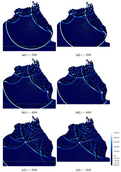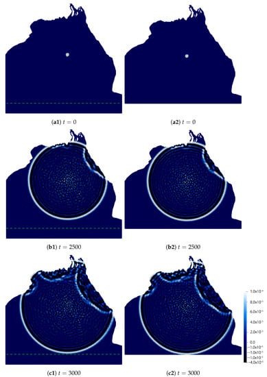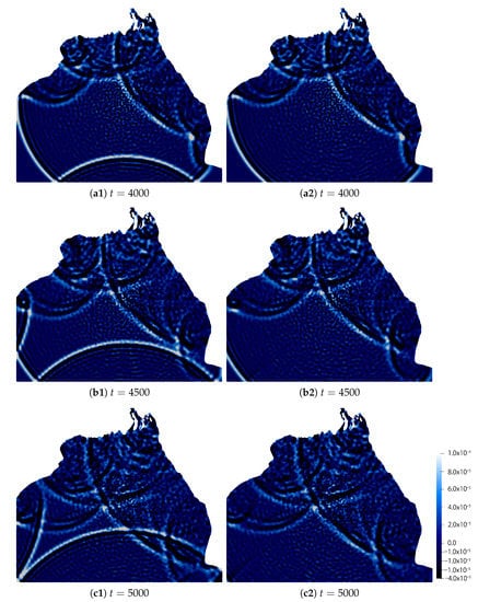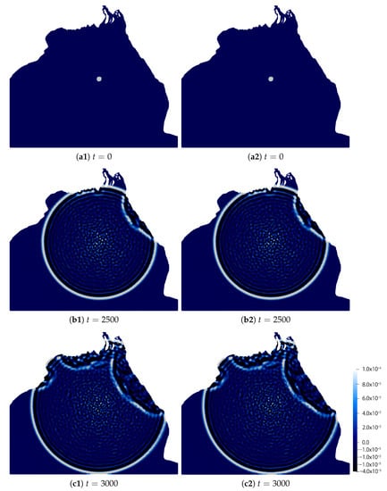 - Case II (the Bay of Bengal). The parameters are the same as Example 4 except the value of . We employ the same mesh and in Section 4.