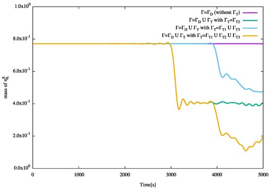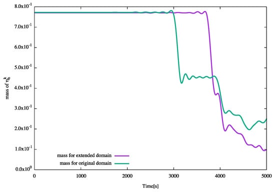respectively, which are first-order approximations in time, where is an upwind point of x with respect to and is the Jacobian determinant of the mapping . In general, the Lagrange–Galerkin method has two advantages; (i) the CFL-free robustness for convection-dominated problems and (ii) the symmetry of the resulting coefficient matrices for the system of linear equations. In addition to the four pioneering works above, many authors have proposed the ideas of this type of approximation in the context of the finite element method, cf. [21,22,23,24,25,26,27,28,29,30,31,32,33,34,35,36,37,38,39,40,41,42,43,44,45,46,47,48] and references therein. When we focus on the SWEs, to the best of our knowledge, Murshed et al. [9] and Murshed [10] firstly solved the SWEs with a TBC by a (single-step) Lagrange–Galerkin scheme of first-order in time for a flat bottom topography. Recently, a two-step mass-preserving Lagrange–Galerkin scheme of second order in time for conservative convection-diffusion problems has been proposed and analyzed with error estimates in [49].