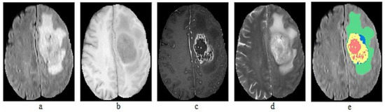 Sample MRI Images of BraTS dataset (a) T1, (b) T1-c, (c) T2, (d) FLAIR, (e) Ground truth.